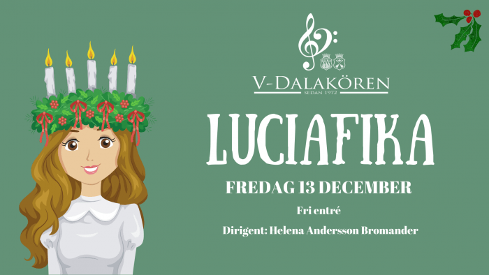 Kom i riktigt ordentlig julstämning med V-Dalakörens årliga luciafika. Njut av fika koristerna själva bakat (lussebullar, knäck, pepparkakor, julmust, glögg, etc) medan du tittar och lyssnar på ett traditionellt luciatåg med stämningsfulla julklassiker. Garanterat julmys!